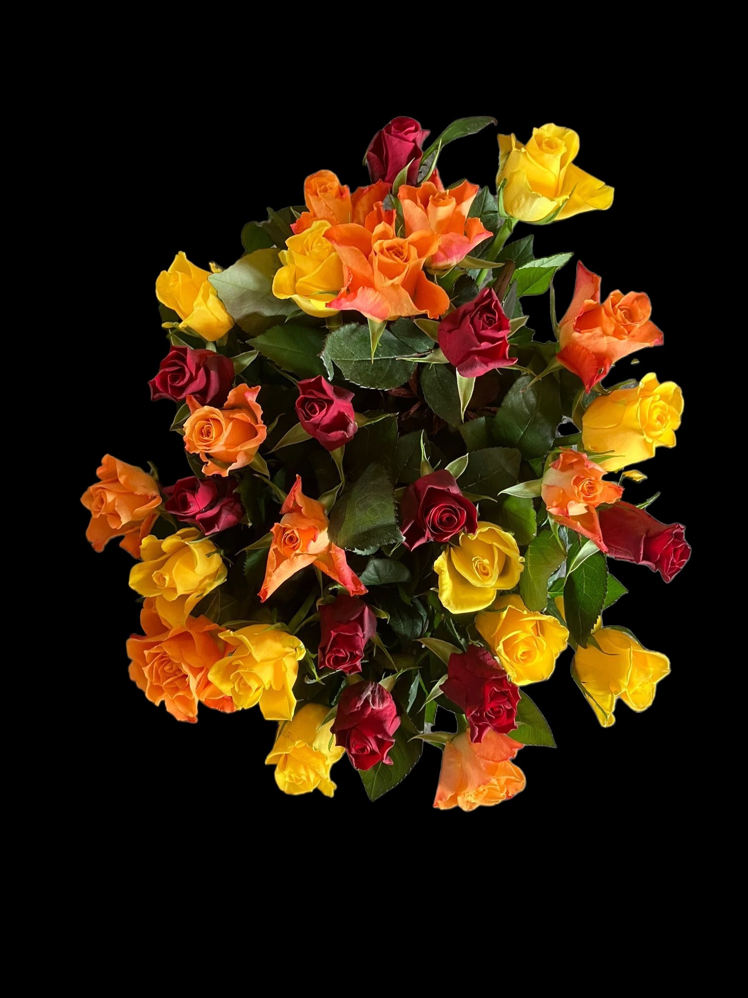 Laat het hart spreken met dit prachtige rozenboeket in warme kleuren. Een krachtige mix van rode, oranje en gele rozen, symbool voor liefde, energie en vriendschap. Dit boeket straalt warmte uit en is perfect als romantisch cadeau, opkikkertje of vrolijke verrassing.